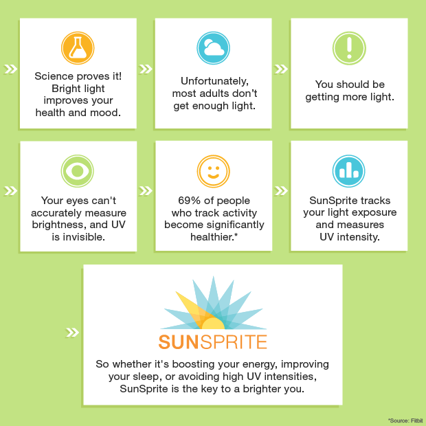 SunSprite is the first solar-powered wearable device that measures and tracks the amount of sun and light that a person is receiving. In its most basic form, it reminds you to get outside and absorb bright light, which wakes up your brain and makes you healthier!